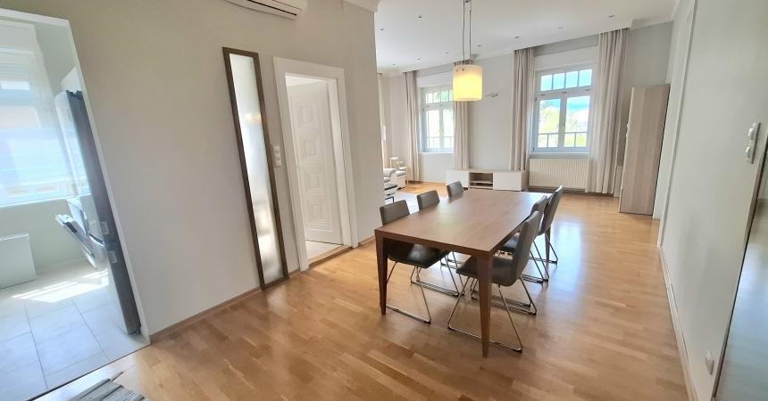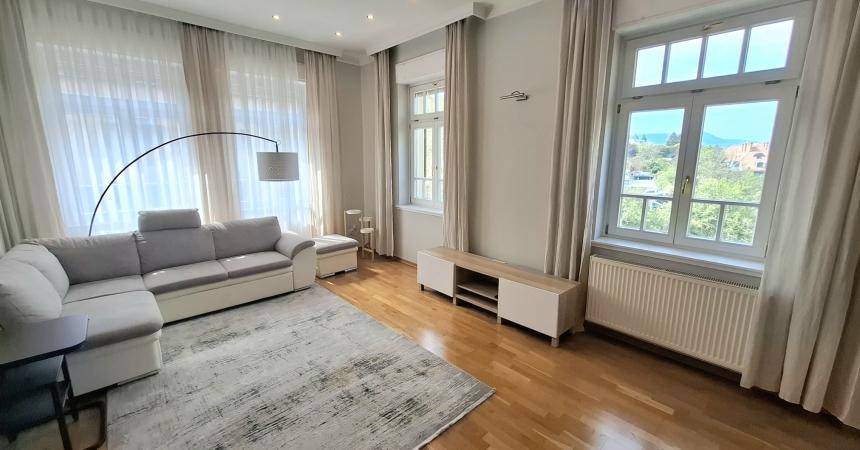 Egy 100 m2-es  csendes, bájos lakás kiadó bútorozva vagy igény szerint  bútor nélkül  a Vár alatt  egy felújított klasszikus villában. Az ablakokból csodás panoráma tárul elénk, látni a hegyoldalt de a Parlamentet is! Található benne egy nagyon világos  étkezős  nappali, felszerelt félig nyitott  konyha, 3 hálószoba, 2 fürdőszoba, erkély.  1 db garázshely tartozik a lakáshoz.
