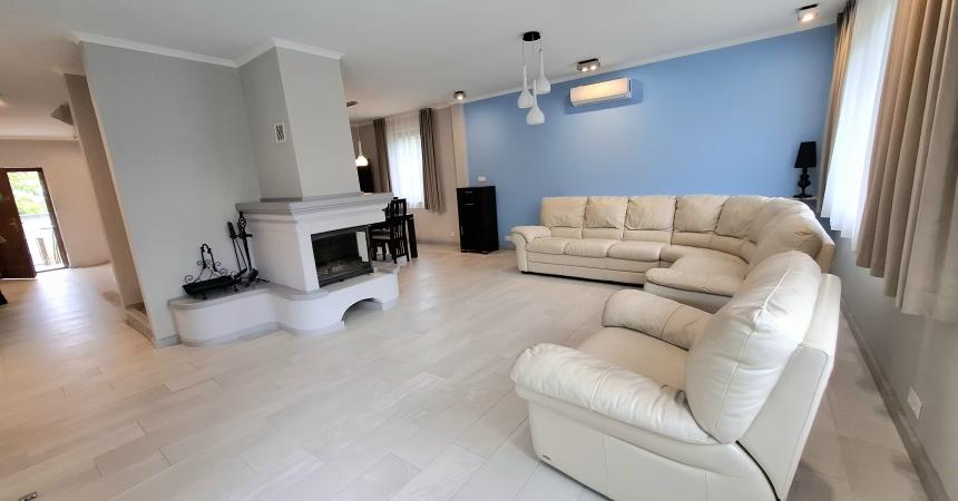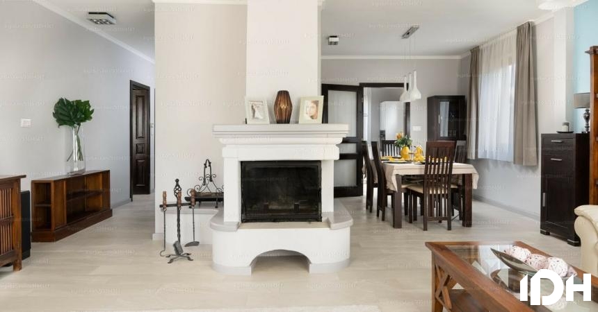Kialakításra került egy önálló vendégszoba saját fürdőszoba WC-vel, egy vendég WC a földszinten. A földszinten található továbbá a konyha, az étkező, a hatalmas kertkapcsolatos nappali, amelyben zárt égésterű fatüzelésű kandalló kapott helyet.