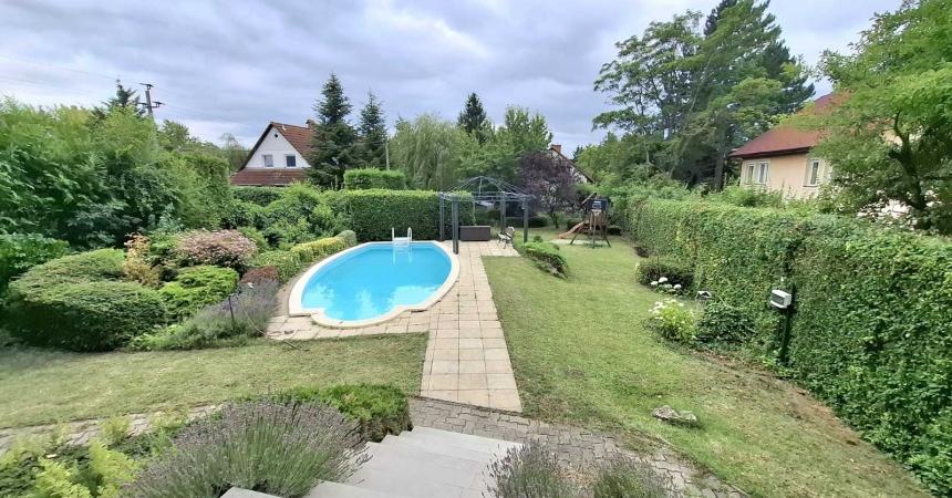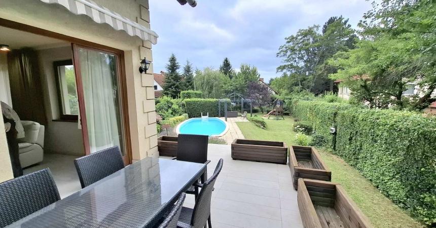 A családi ház kertkapcsolatos. 8*4m-es változó mélységű medence, illetve egy igazi játszótér homokozóval, hintával, dupla mászóvárral. A kertben automata locsolórendszer van.